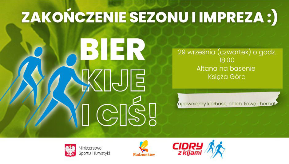 Zapraszamy wszystkich uczestników projektu Bier Kije i Ciś na zakończenie sezonu. Zapewniamy kiełbaski chleb kawę i herbatę. Zachęcamy do przyniesienia czegoś od siebie (ciasto, sałatka itp.).